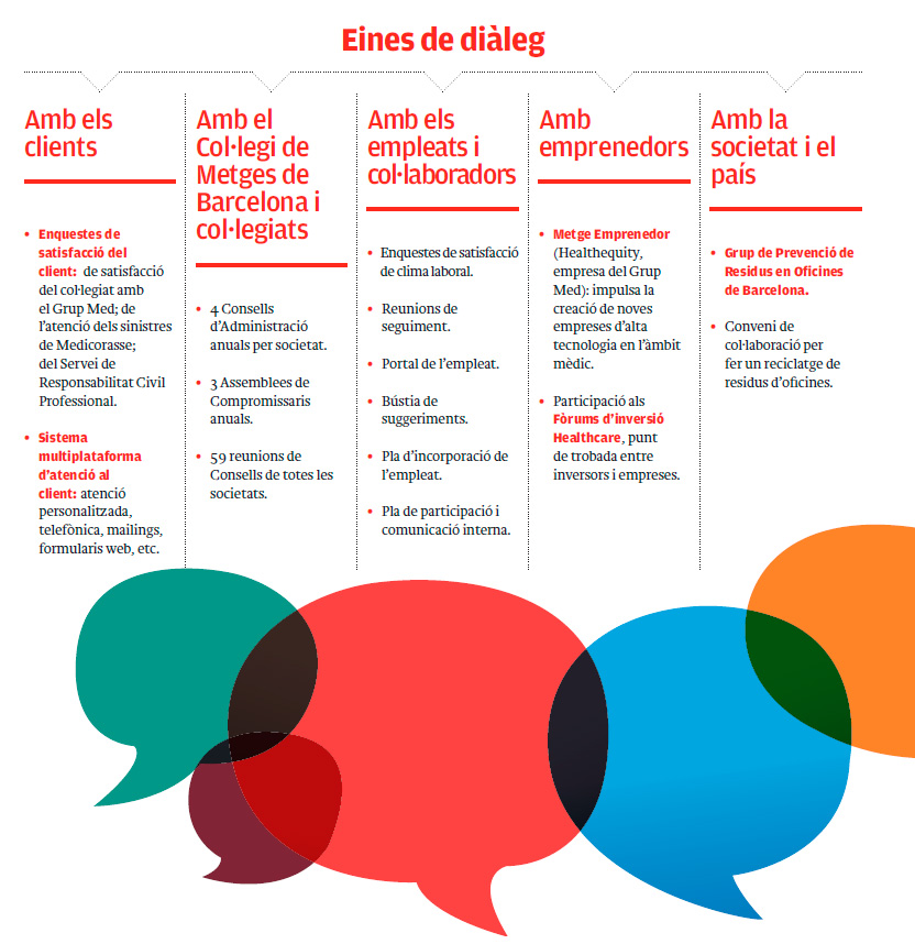 Definim els grups d'interès com aquelles entitats o individus que estan afectats significativament per les activitats, productes i serveis del Grup Med: clients, Col·legi i col·legiats, empleats, col·laboradors, emprenedors, societat i país. Conèixer les seves expectatives i requeriments és un aspecte fonamental per desenvolupar la nostra estratègia. Hi mantenim una comunicació fluida i bidireccional a través de diferents eines de diàleg que ens permeten conèixer els temes que més els preocupen o interessen i que són, alhora, rellevants per a nosaltres per afrontar els reptes i les oportunitats que sorgeixen en el desenvolupament de la nostra activitat