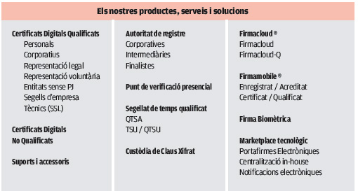 • Hem reformulat la nostra cartera de productes per tal de fer-la més simple i alhora molt més competitiva. El resultat ha estat una cartera amb productes, solucions i serveis complerta per poder donar resposta als nous reptes del mercat. Així doncs, els productes agrupen el nostre negoci tradicional de certificats, entre les nostres solucions cal fer esment de Firmacloud, Firmamobile i Firma Biomèdica i, a l'últim, els serveis que s'emmarquen dins del disseny, la creació o la gestió d'Autoritats de Registre, Punts de verificació presencial o Segells de temps.